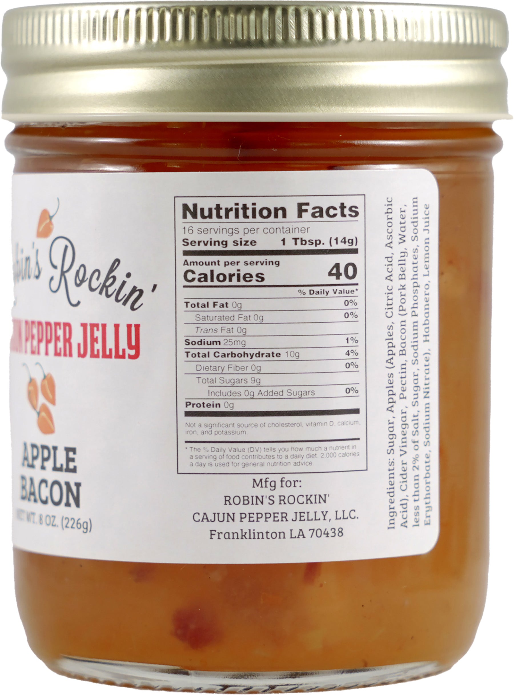 A moderately spicy combination of chopped apples, locally grown habanero and locally processed bacon. Goes well on a grilled cheese sandwich, or with meat, green vegetables, baked brie or a nice sharp cheddar cheese.