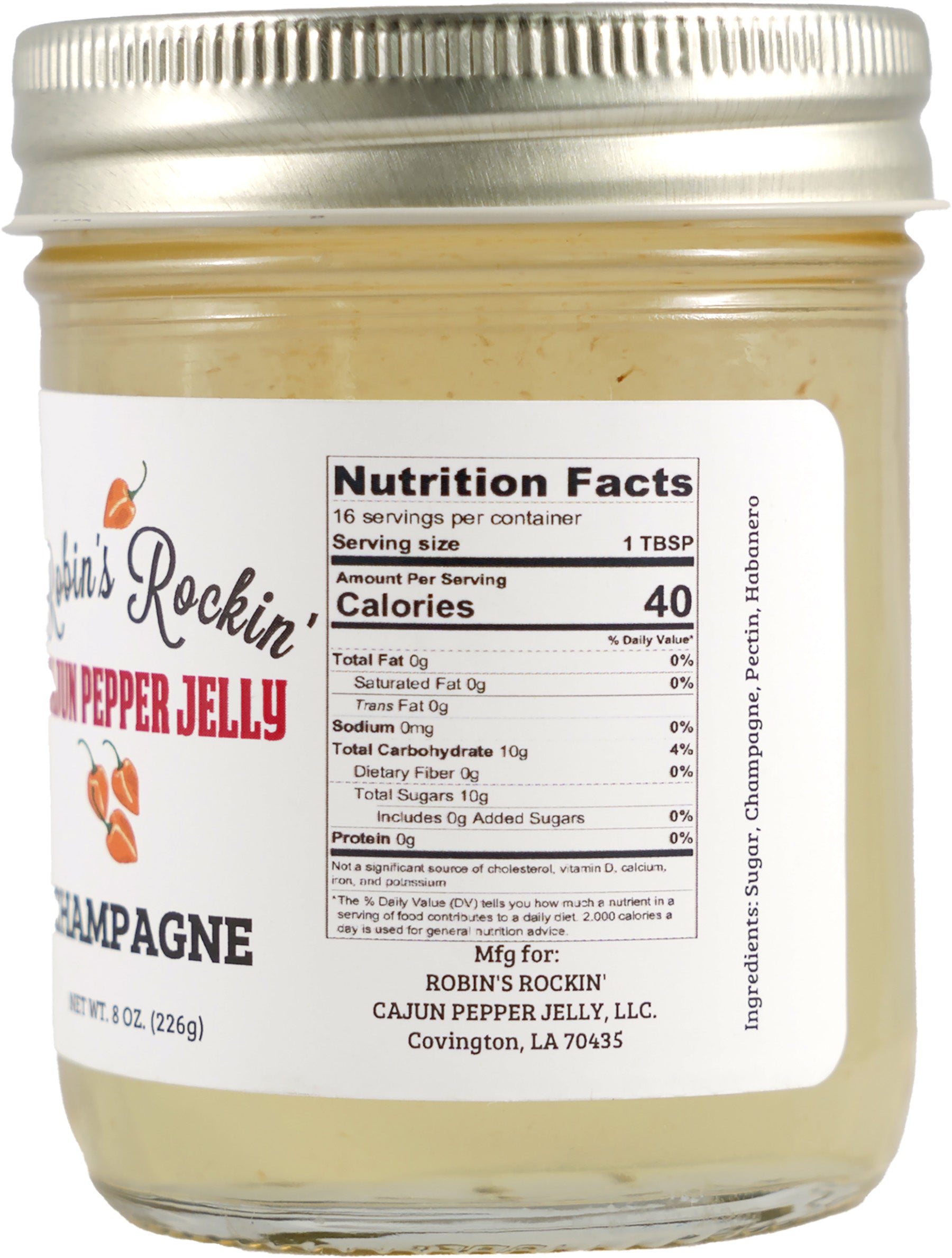 An elegant blend of champagne and locally grown habaneros. This spicy hot pepper jelly pairs well with mild fish, chicken breast, brie, chocolate, and it makes a great vinaigrette for salad and fresh fruit.