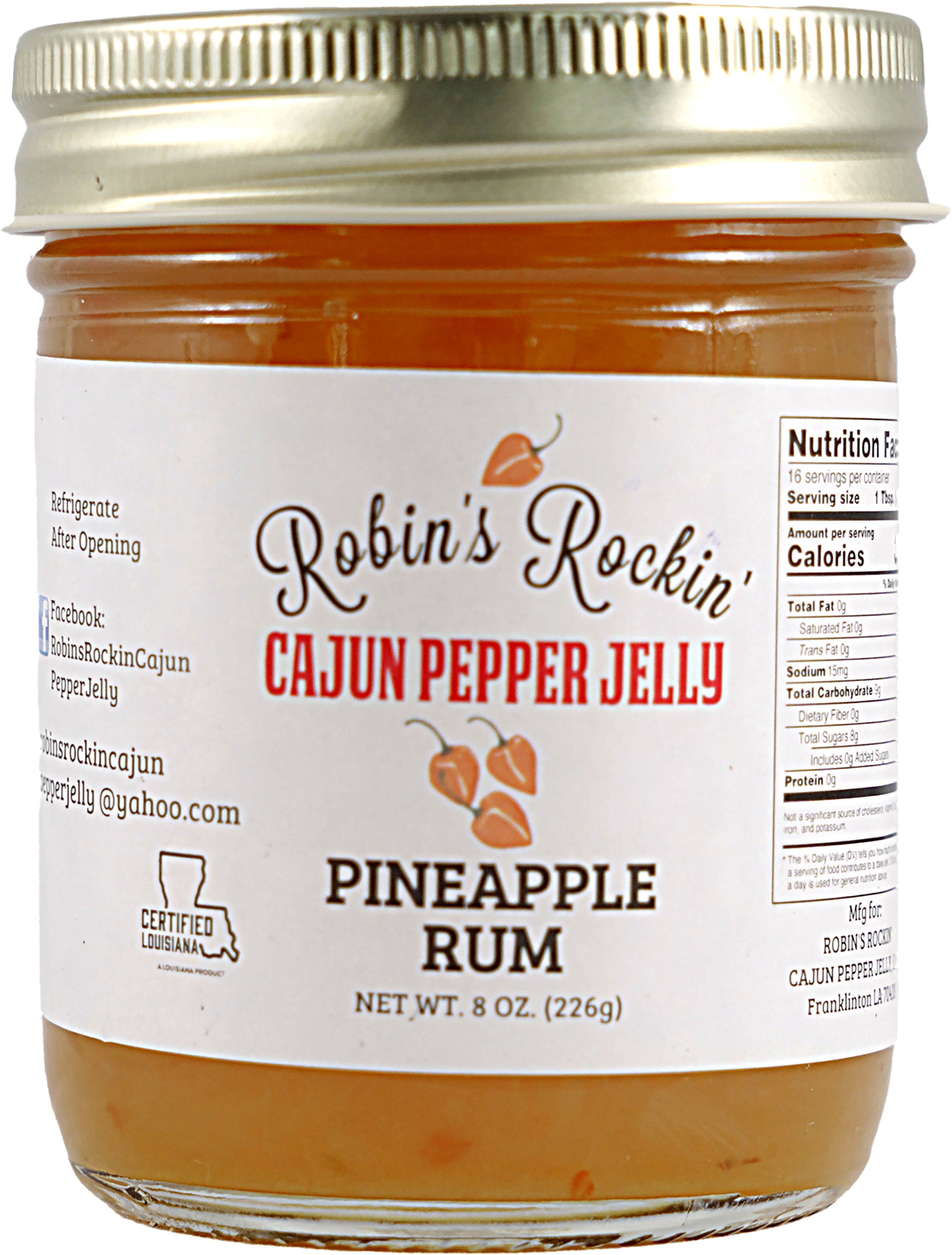 Pineapple Rum- A spicy hot combination of crushed pineapples, fresh lemon juice, locally grown habanero and Bacardi Rum! This makes happy seafood, meat and pizza and it kicks up a boring salsa and pairs well with a nice sharp cheddar cheese.